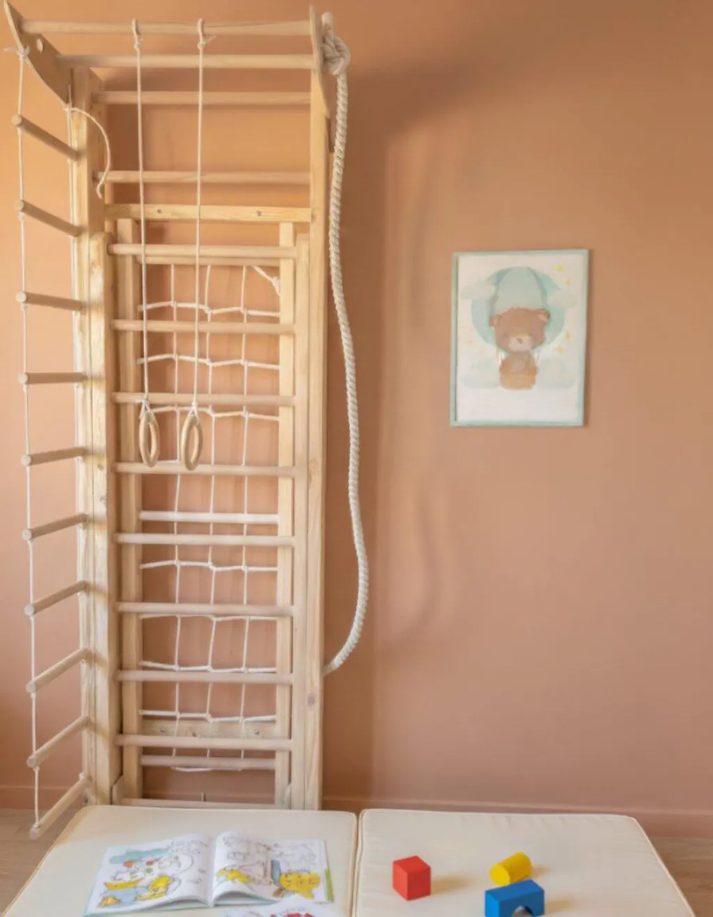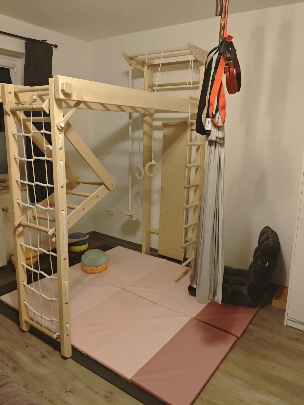 Für ein sicheres Klettererlebnis empfehlen wir derzeit hochwertige Turn- oder Fallschutzmatten mit rutschfester Unterseite. Wir entwickeln gerade eigene BeLissi-Matten, die speziell auf BeLissi Kletterwände abgestimmt sind – in Kürze direkt in unserem Shop erhältlich.